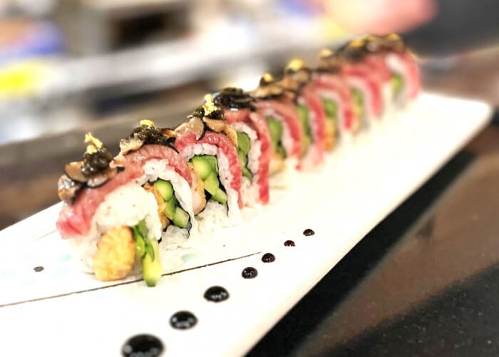 Raw. Shrimp tempura, spicy tuna, snow crab, avocado, cucumber, Asian mix, eel sauce.